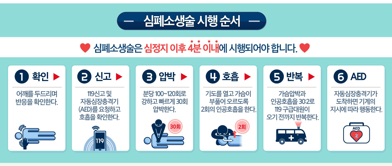 심정지는 때와 장소를 가리지 않고 심장의 박동이 멈추는 상태입니다.말하다.