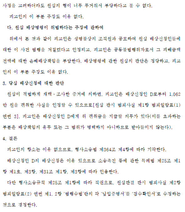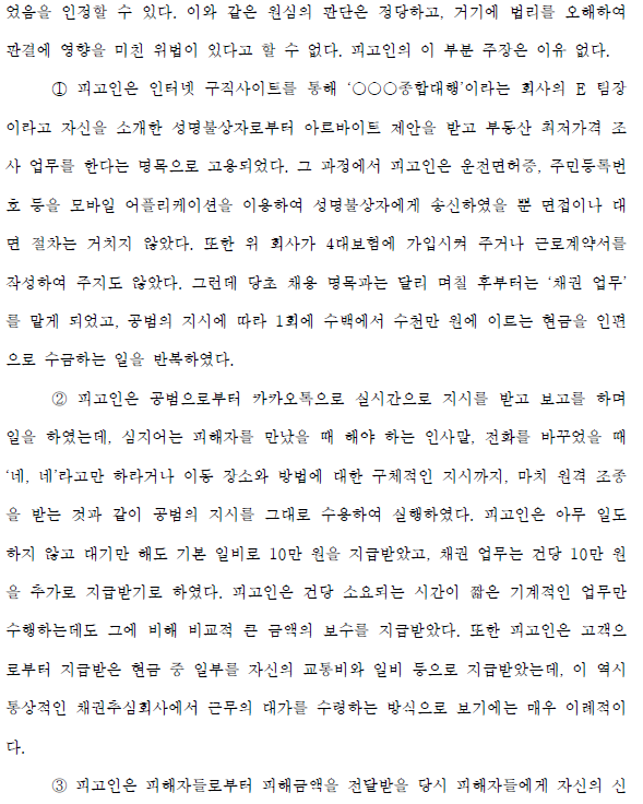 ② 피고인은 카톡으로 공범으로부터 실시간 지시를 받고 출근하여 피해자를 만날 때 인사를 하고, 전화번호를 바꿀 때 “네, 네”라고 말하거나, 어디로 어떻게 이동할 것인지 구체적으로 지시하는 등의 지시를 받았고, 공범의 명령을 원격조종하듯이 수행했다. 피고인은 기다리기만 해도 기초생활수당으로 10만원을 지급받았고, 보석금으로 건당 10만원을 추가로 받는 것을 선택했다. 피고인은 건당 짧은 시간이 소요되는 기계 작업만 수행했지만 비교적 많은 금액을 지급받았다. 또한 피고인은 의뢰인이 지불한 교통비와 일용비의 일부를 받았는데, 이 역시 일반 채권추심회사에서 일하면서 보상을 받는 것은 매우 이례적입니다.
