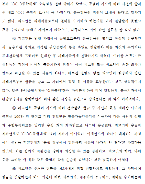 ⑤ 피고는 공범자의 지시에 따라 전달받은 현금 중 자기 몫이 없는 나머지 금액을 타인의 명의와 주민등록번호를 입력한 수십 개의 계좌번호로 나누어 전달받은 ATM 예치금을 통해 1,000,000 단위로 나누어 송금한다. 100만원. 피고인이 송금한 계좌번호도 ‘○○○총대리점’이라는 이름의 계좌가 아니었다. 공범은 이체한도를 논의하던 중 피고인에게 “창구에 예치하면 세금이 나오지 않아야 한다”고 말했는데, 이는 범죄의 일부로 강하게 의심될 수 있는 상황이며, 피고인의 학력, 나이, 등 공범의 말을 당시에는 믿었다는 게 믿기지 않는다.