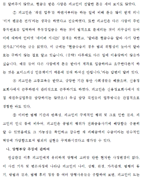 ⑨ 피고인은 범죄의 지속시간과 빈도, 피고인의 구체적인 행위와 그 결과, 피고인의 인정 등을 고려할 때 공범자의 행위가 전화금융사기에 해당함을 충분히 인지하면서 이에 동의하고 피해감소 가능성 및 용인 가능성 가. 범행의 자각은 돈을 모으는 본질적인 역할에 가담함으로써 이루어졌다고 평가할 수 있다.
