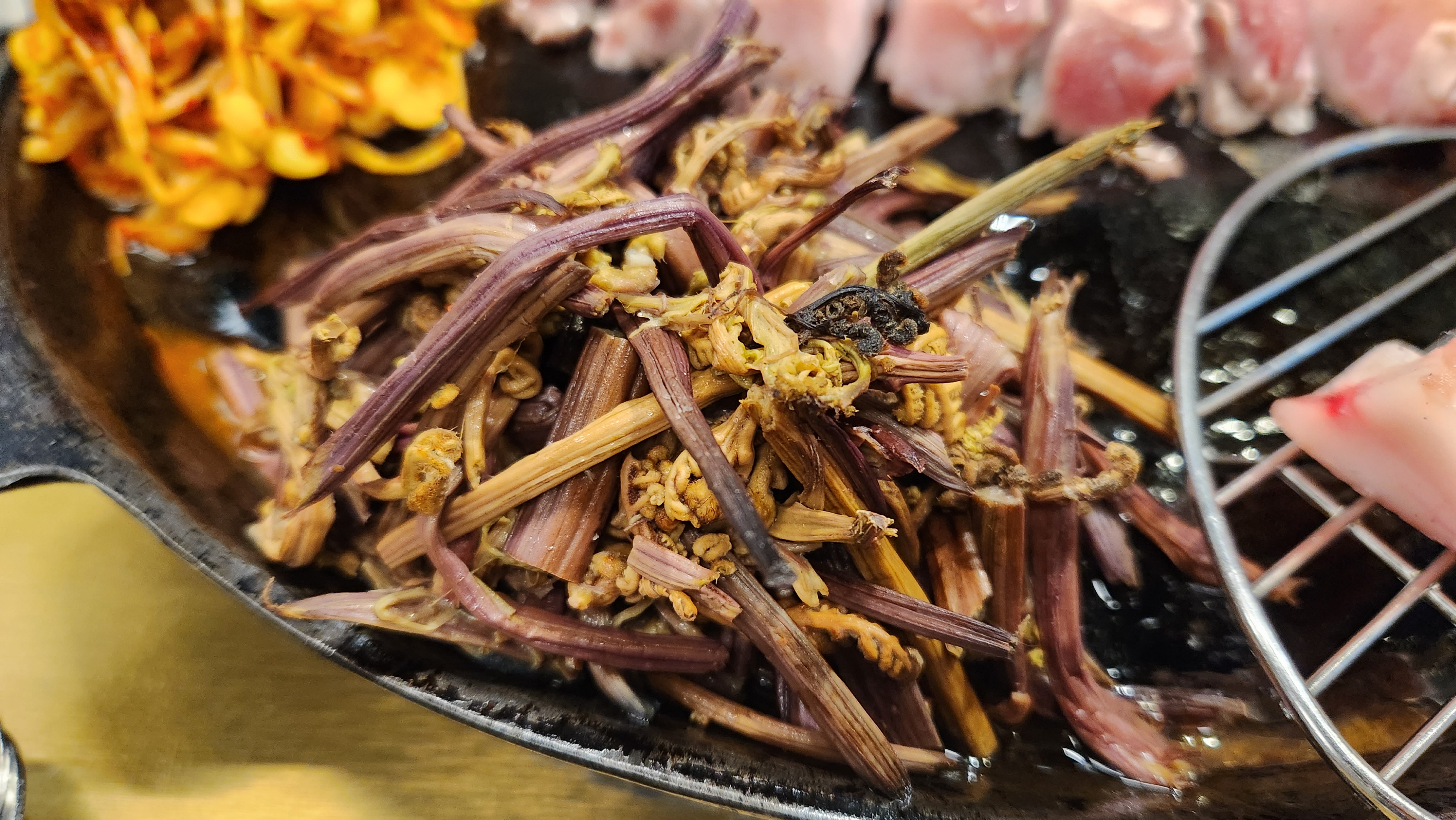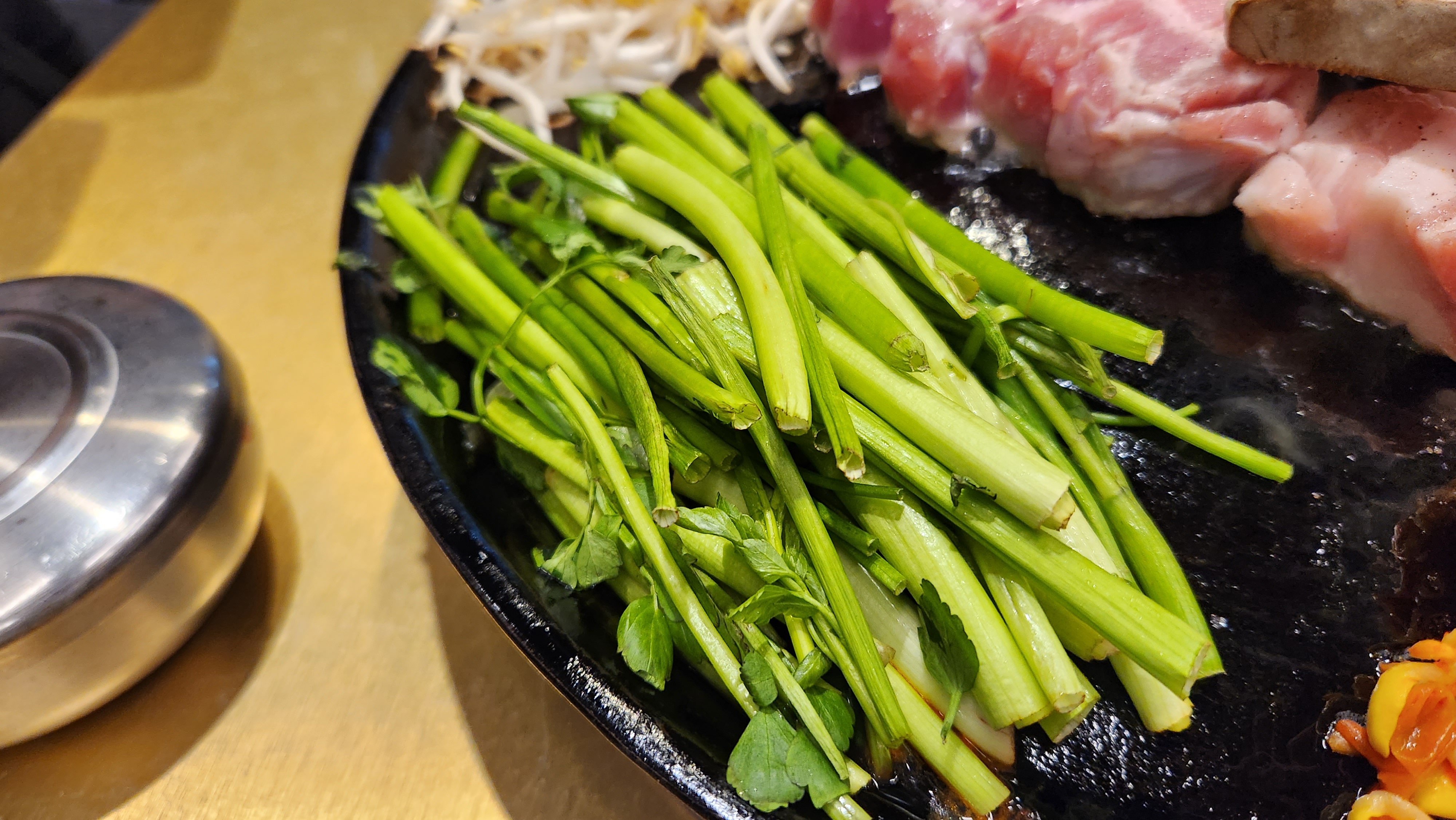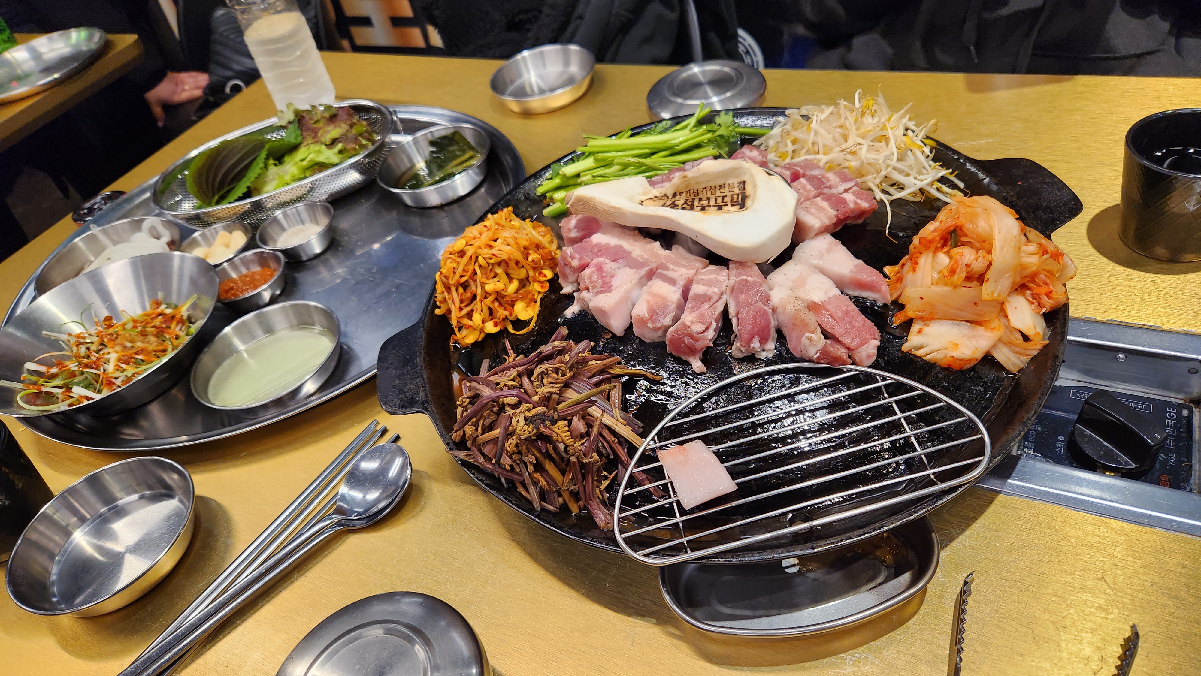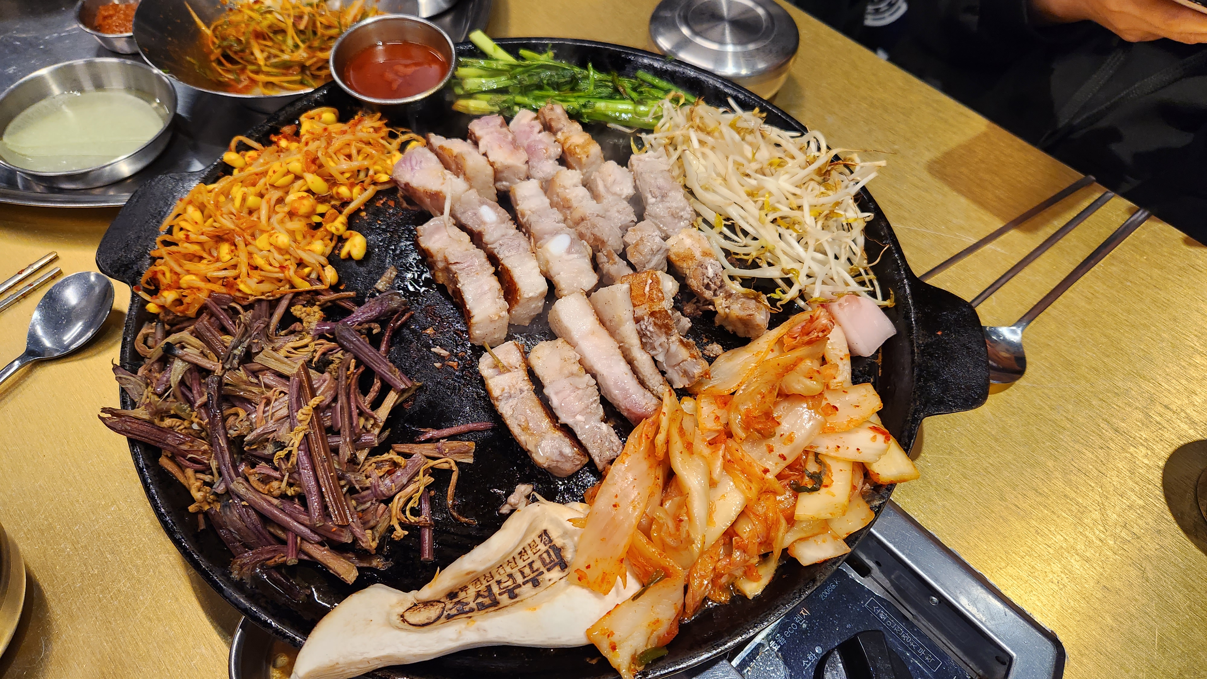 돼지고기 한상이 준비되었습니다. 스태프가 기본 셋팅은 물론 디글레이즈까지 해줘서 편안하게 먹을 수 있었습니다. 조용히 밀을 굴리면서 맛있게 먹을 마음의 준비만 하면 된다. 콩나물무침, 고사리, 미나리, 김치, 새송이버섯