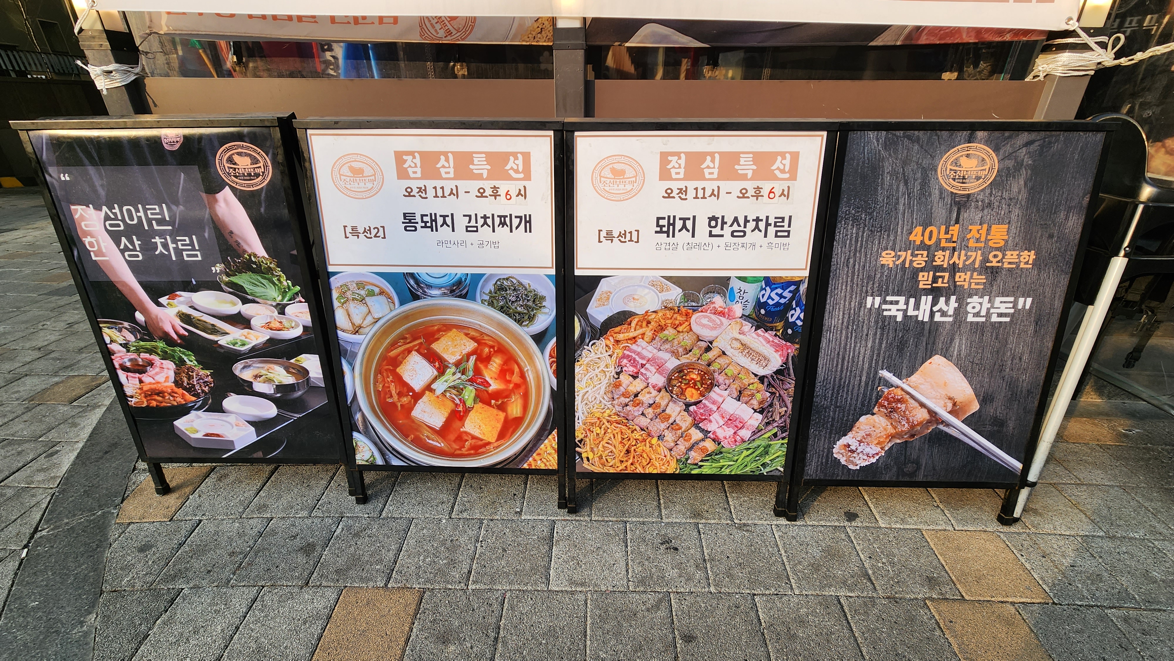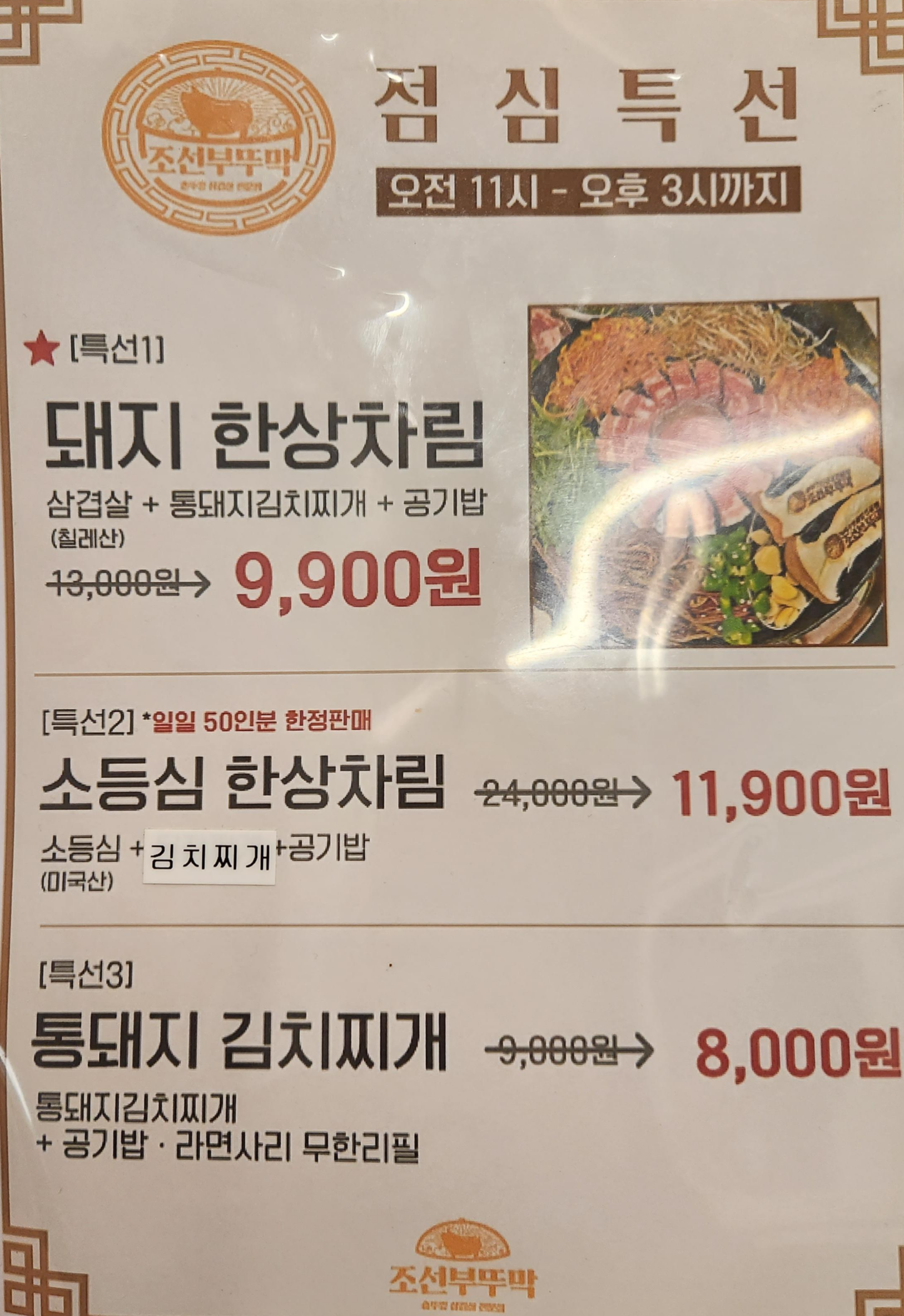 하지만 질문이 있습니다. 우리가 식당을 방문한 것은 오후 3시 이후였습니다. 조금 늦은 점심을 먹으러 나갔다가 조금 이른 저녁을 먹었다. 그런데 가게 외부 현수막에는 점심특선이 오후 6시까지라고 명시되어 있었는데, 들어가서 메뉴판을 보니 오후 3시까지라고 분명히 적혀있었다. 그래서 물어보니 밖에 있는게 맞다고 하더군요. 마음에 들어 점심특선 1호 돼지한상 2인 세트를 주문했습니다.
