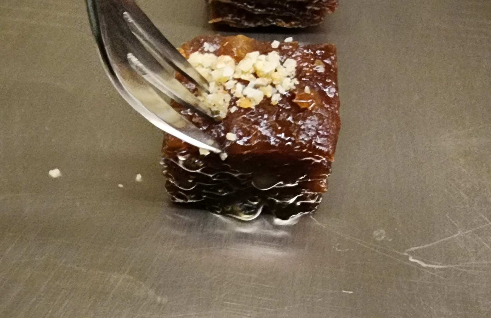포크로 가볍게 누르면 꿀이 떨어지는 것을 볼 수 있습니다. 맛은 작은 조각에 집중되어 있습니다.